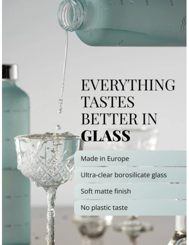 Kvaliteetsest borosilikaat klaasist Equa joogipudel. 100% lekkimiskindla korgiga veepudel. Pudelit võib pesta nõudepesumasinas. Valmistatud EU-s.